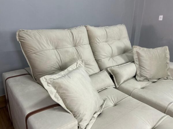 Acompanha 2 almofadas e 2 rinheiras preenchidas com fibra siliconada. Catraca blindada com 10 níveis de reclinação.