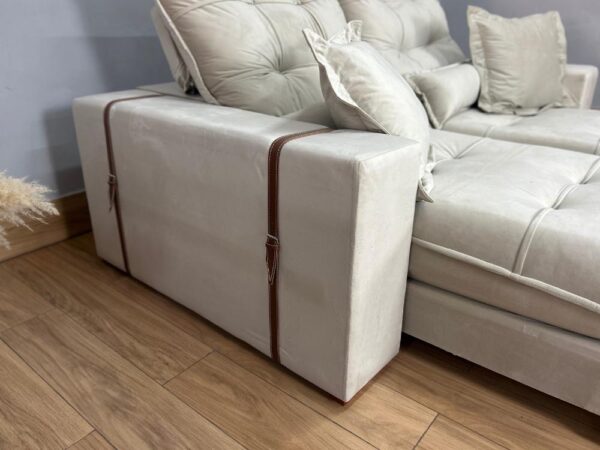 Com detalhe em couro nas laterais e em cima do braço.